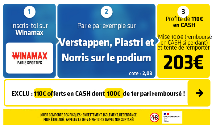 ► 2- Misez par exemple sur le pari "Norris, Verstappen et Piastri terminent sur le podium" (cote à 2,03) chez Winamax :