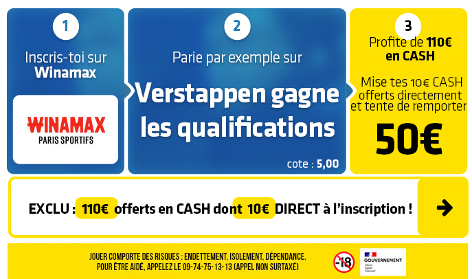 ► Misez par exemple sur le pari "Verstappen remporte les qualifications" (cote à 5,00) chez Winamax :