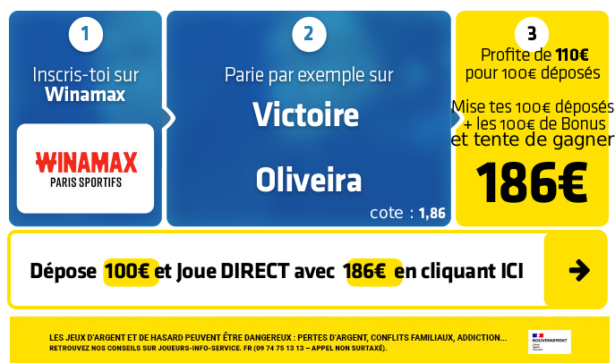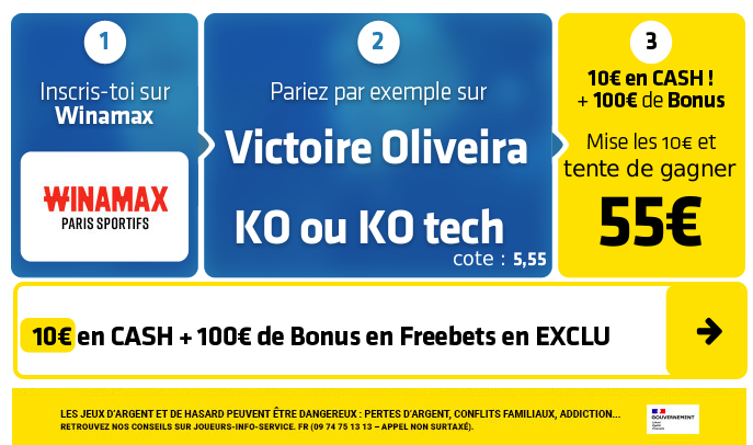 ► Misez par exemple sur le pari "Victoire Oliveira KO/ KO technique ou disqualification" (cote à 5,50) chez Winamax :
