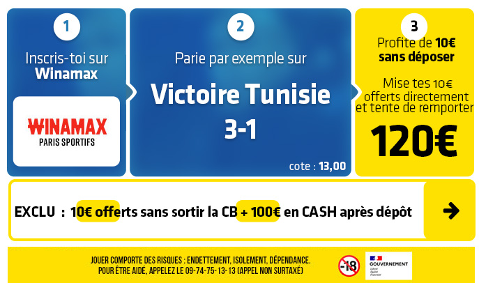 ► Le pari "Victoire Tunisie 3-1" est coté à 13,00 chez Winamax