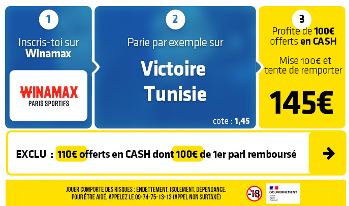 ► 1- Misez par exemple sur le pari "Victoire Tunisie" (cote à 1,45) chez Winamax :
