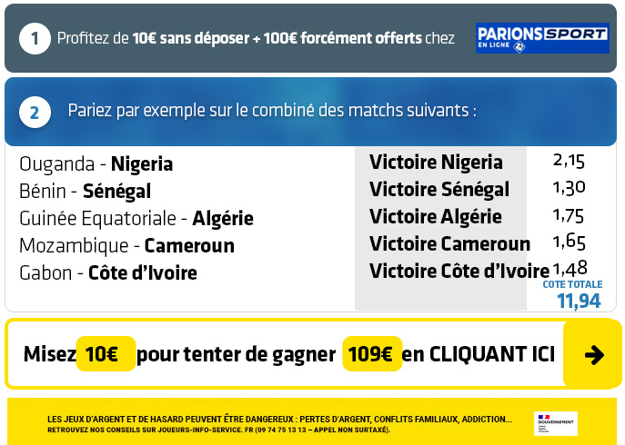 ► 1- Misez par exemple sur le pari "Victoires Nigeria + Sénégal + Algérie + Cameroun + Côte d'Ivoire" cotée à 11,94 chez ParionsSport