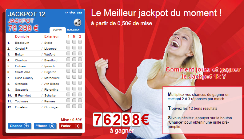Forcément, nous vous conseillons de jouer ce week-end sur le Jackpot 12 et sa somme folle pour la Saint Valentin. Vous êtes gagnant à partir de 12 bons résultats et pouvez donc gagner plus de 75.000 € à partir de 0,50 € de mise seulement !