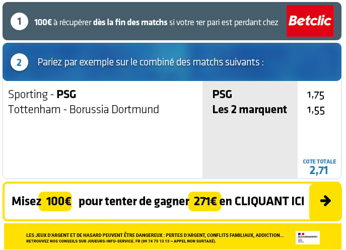 ► Le pari combiné "Victoire PSG + Les deux équipes marquent entre Tottenham et le Borussia Dortmund" est coté à 2,71 chez Betclic
