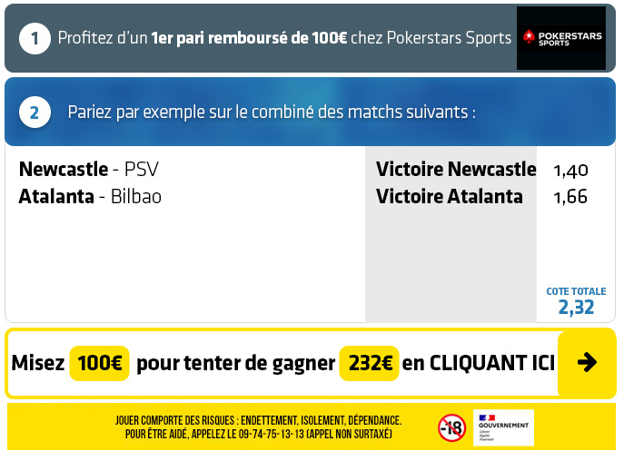 ► Le pari "Victoire Newcastle + Victoire Atalanta" est coté à 2,32 chez Pokerstars Sports