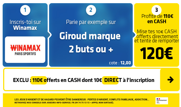 ► Misez par exemple sur le pari "Giroud marque 2 buts ou plus" (cote à 12,00) chez Winamax :