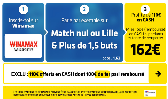 ► 1- Misez par exemple sur le pari "Match nul ou Victoire Lille & Plus de 1,5 buts" (cote à 1,62) chez Winamax :