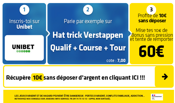 ► Misez par exemple sur le pari "Hat trick Max Verstappen (qualif + course + meilleur tour en course)" (cote à 7,00) chez Unibet pour tenter de gagner 60€