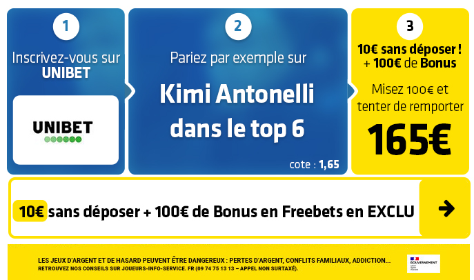 ► Le pari "Kimi Antonelli dans le top 6" est coté à 1,65 chez Unibet