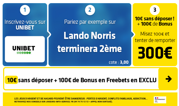 ► Le pari "Lando Norris terminera 2eme" est coté à 3,00 chez Unibet