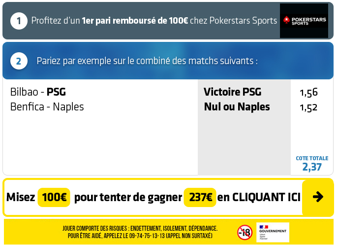 ► Le pari "Victoire PSG + Match nul ou victoire Naples" est coté à 2,37 chez Pokerstars Sports