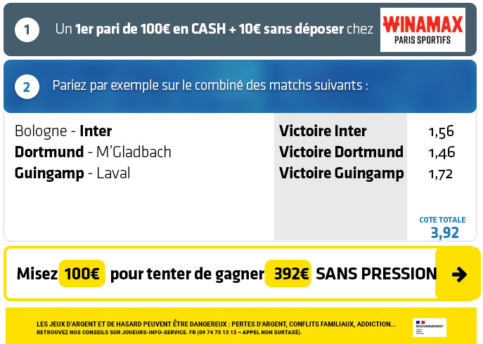 Misez par exemple sur le pari "Victoires Inter + Dortmund + Guingamp" (cote à 3,92) chez Winamax :