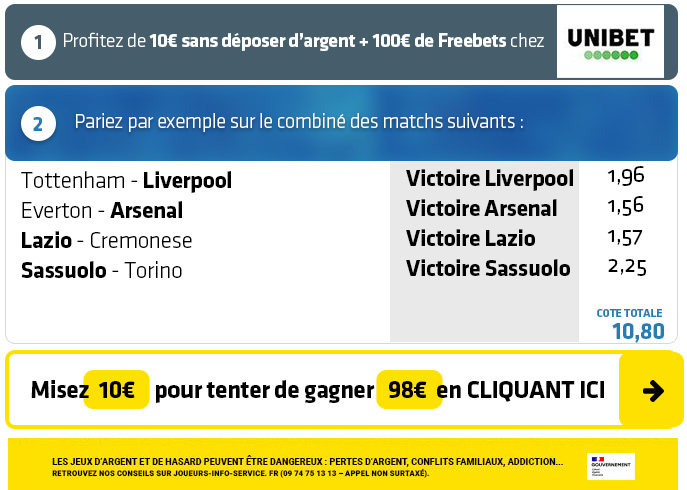 ► 2-Misez par exemple sur le pari "Victoires Liverpool + Arsenal + Lazio + Sassuolo" (cote à 10,80) chez Unibet pour tenter de gagner 98€