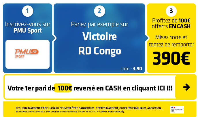 Misez par exemple sur le pari "Victoire RDC" (cote à 3,90) chez PMU :