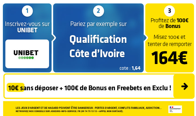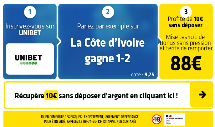 ► Misez par exemple sur le pari "Victoire Côte d'Ivoire 1-2" (cote à 9,75) chez Unibet pour tenter de gagner 88€
