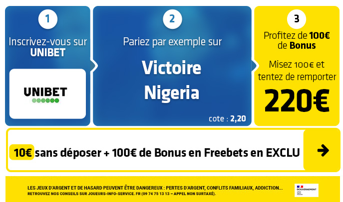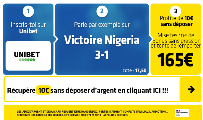 ► Misez par exemple sur le pari "Victoire Nigeria 3-1" (cote à 17,50) chez Unibet pour tenter de gagner 165€