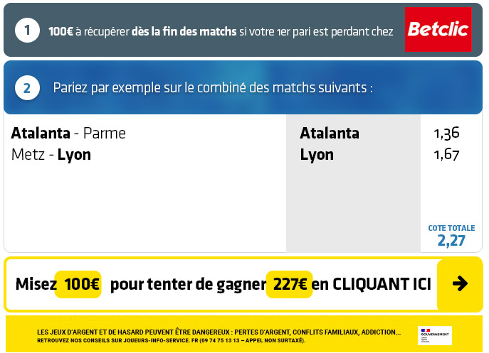 ► Le pari combiné "Victoire Atalanta + Victoire Lyon" est coté à 2,27 chez Betclic