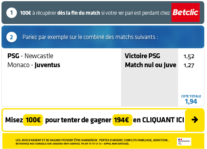 ► Le pari combiné "Victoire PSG + Nul ou Juventus" est coté à 1,93 chez Betclic