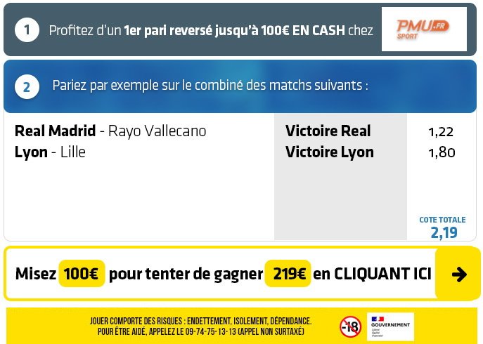 ► Le combiné "Victoire Lyon + Victoire Real Madrid" est coté à 2,19 chez PMU Sport