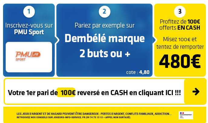 ► Le pari "Dembélé marque 2 buts ou plus" est coté à 4,80 chez PMU Sport