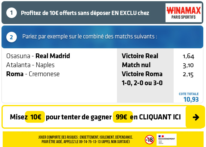 ► Le pari "Victoire Real Madrid + Match nul Atalanta - Naples + Victoire Roma 1-0, 2-0 ou 3-0" est coté à 10,93 chez Winamax