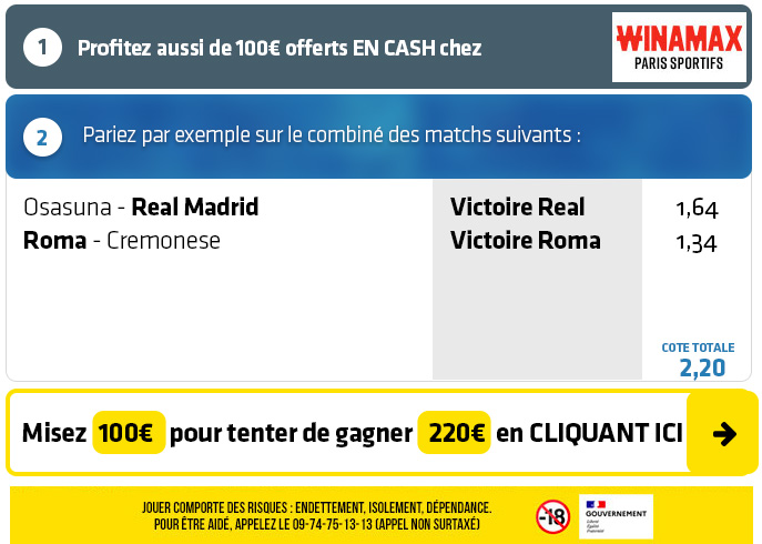 ► 1- Misez par exemple sur le pari "Victoire Real Madrid + Victoire Roma" (cote à 2,20) chez Winamax :