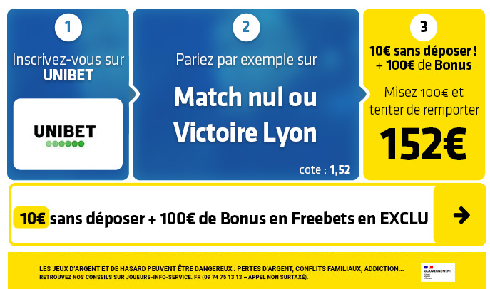► Misez par exemple sur le pari "Victoire Lyon 1-2" (cote à 8,00) chez Unibet pour tenter de gagner 70€
