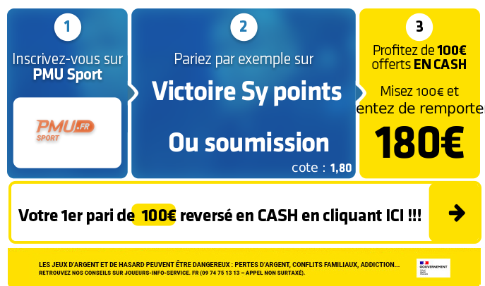 ► 2- Le pari "Sy vainqueur aux points ou soumission" est coté à 1,80 chez PMU Sport