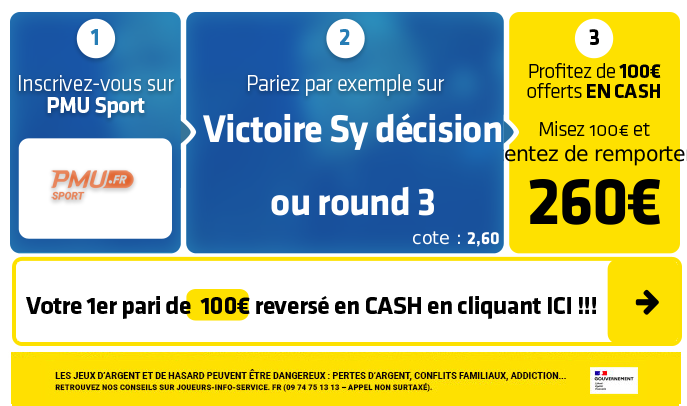 ►1- Le pari "Victoire Sy à la décision ou round 3" est coté à 2,60 chez PMU Sport