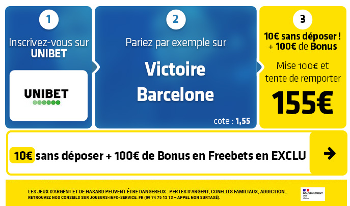 ► 1- Le pari "Victoire Barcelone" est coté à 1,55 chez Unibet