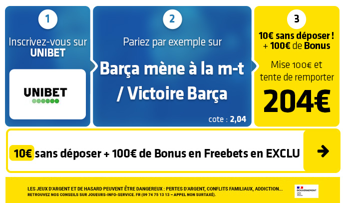► Misez par exemple sur le pari "Victoire Barcelone 4-1" (cote à 13,80) chez Unibet pour tenter de gagner 128€