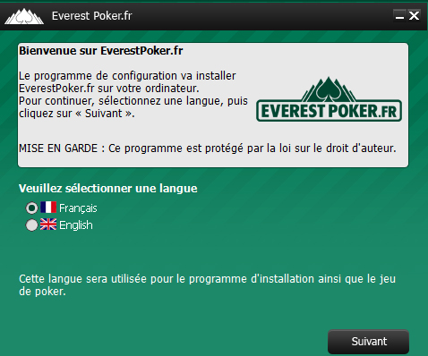 Lancez le logiciel Everest Poker. Choisissez la langue de votre choix (Français ou Anglais) et acceptez les conditions pour continuer l'installation.