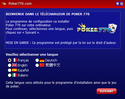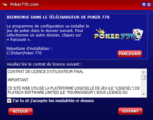 Télécharger et installer Poker 770 est simple et rapide. Après avoir cliqué sur notre « lien de téléchargement », Il vous suffit de suivre notre guide pas à pas pour installer le logiciel de Poker 770, créer un compte, mettre le code Bonus et ainsi profiter de promotions et avantages exclusifs.