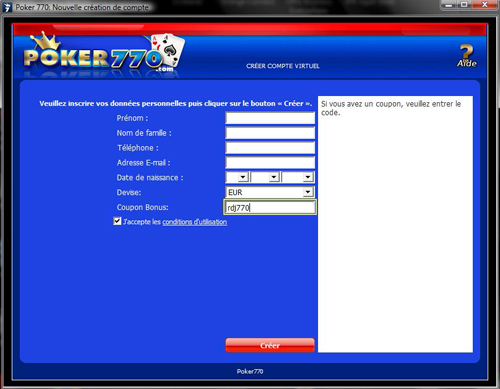 Remplissez le formulaire en communiquant des données correctes (celles ci pourront être vérifiées). Entrez le code bonus "RDJ770" dans la case "Coupon Bonus" et vous obtiendrez un bonus égal au montant de votre dépôt et ceci jusqu'à 600$ ainsi que 7$70 Offerts pour tester Poker 770.
