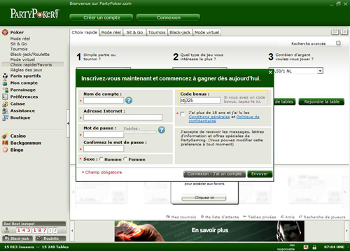Une fois l'installation terminée, le logiciel de Party Poker va se lancer. Cliquez sur "Créer un compte" pour vous inscrire :