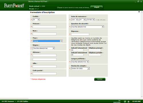 Remplissez le formulaire en choisissant un pseudo qui vous ressemble et un mot de pass suffisament complexe (Lettres et Chiffres mélangés). Entrez ensuite le code bonus exclusif : rdj325 pour profiter d'un bonus de 500$ et de promotions réservées aux joueurs de RueDesJoueurs.