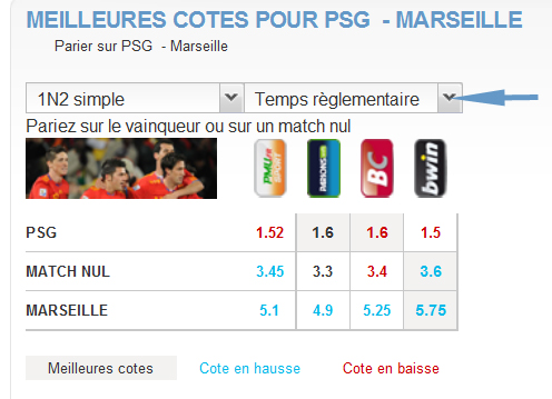 Le comparateur de cote RueDesJoueurs, disponible pour tous les matchs, vous permet de comparer les cotes sur quasiment tous les types de paris qui existent sur le match. Pour accéder à celui qui vous intéresse, cliquez sur le menu déroulant indiqué dans l'image ci-dessous par la flèche bleue.