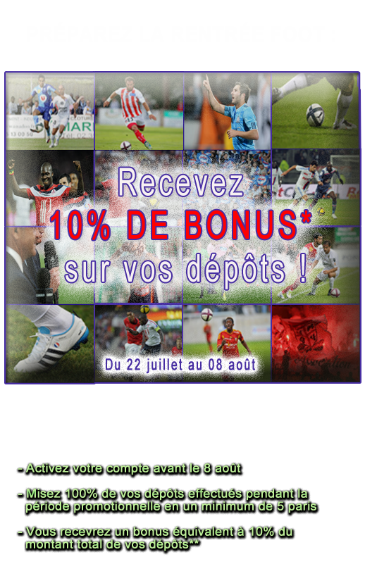France Pari: Après le Super Combino tombé dans la semaine, c'est une nouvelle offre qui point le bout de son nez chez l'opérateur. France Pari voit grand et vous offre la possibilité de décorcher 10% de l'ensemble de vos dépôts effectués entre le 22 juillet et le 8 août. Attention, vous devez valider votre compte avant la fin de la promotion (8 août)!. Coup d'oeil.