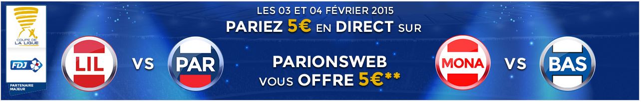 ParionsWeb vous offre aujourd'hui et demain 5 € offerts pour les 300 premiers parieurs des demi-finales de la Coupe de la Ligue ! Une offre à ne pas manquer !