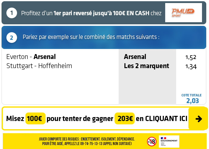 ► Le combiné "Victoire Arsenal + Stuttgart - Hoffenheim : Les deux équipes marquent" est coté à 2,03 chez PMU Sport