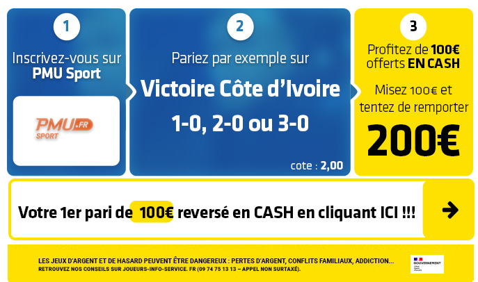 ► Le pari "Victoire Côte d'Ivoire 1-0, 2-0 ou 3-0" est coté à 2,00 chez PMU Sport