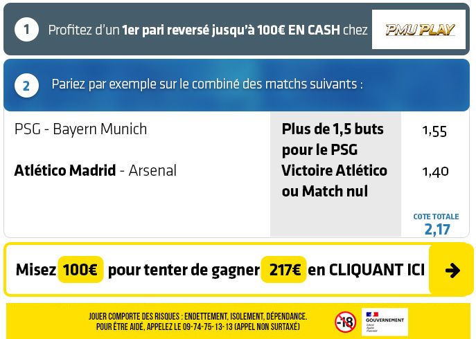 ► Le combiné "Plus de 1,5 buts pour le PSG + Victoire Atlético Madrid ou Match nul" est coté à 2,17 chez PMU PLAY
