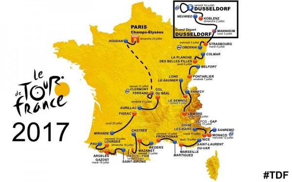 Ce samedi 1er juillet, le Tour de France s'élance de Düsseldorf en Allemagne pour relier Paris 3 semaines plus tard. Entre temps, les coureurs traverseront 4 pays et devront parcourir plus de 3540kms en 21 étapes. Feuille de route du parcours de cette 104ème édition de la Grande Boucle.