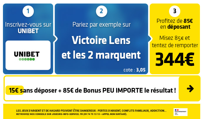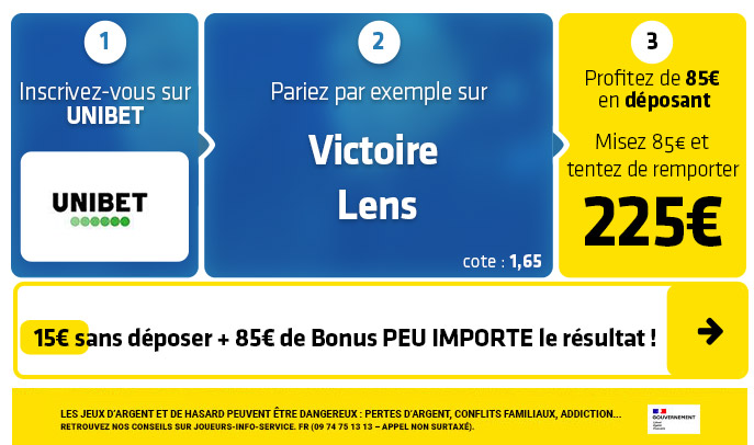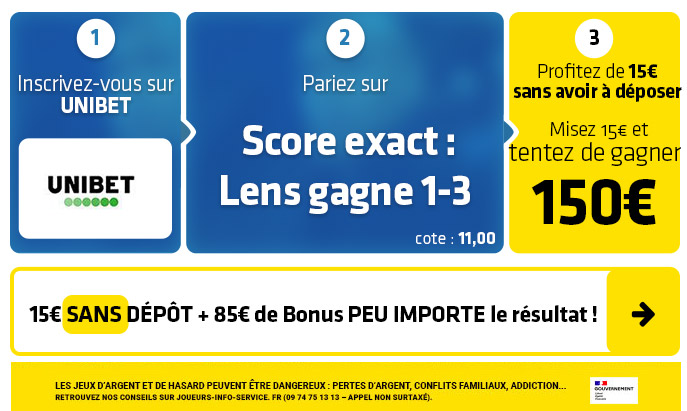 ► 1-Misez par exemple sur le pari "Victoire Lens 1-3" (cote à 11,00) chez Unibet pour tenter de gagner 150€