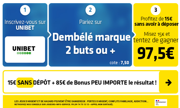 ► 1-Misez par exemple sur le pari "Dembélé marque 2 buts ou plus" (cote à 7,50) chez Unibet pour tenter de gagner 97,50€
