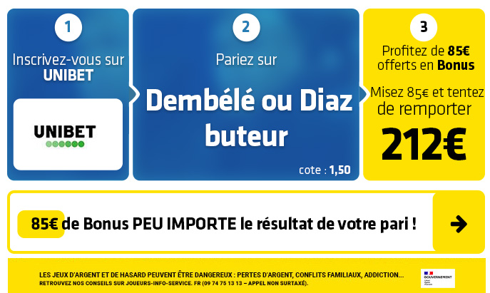 ► Le pari "Dembélé ou Luis Diaz buteur" est coté à 1,50 chez Unibet