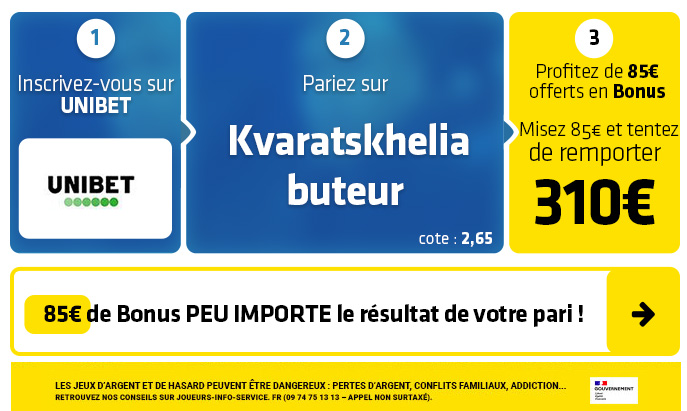 ► Le pari "Kvaratskhelia buteur" est coté à 2,65 chez Unibet