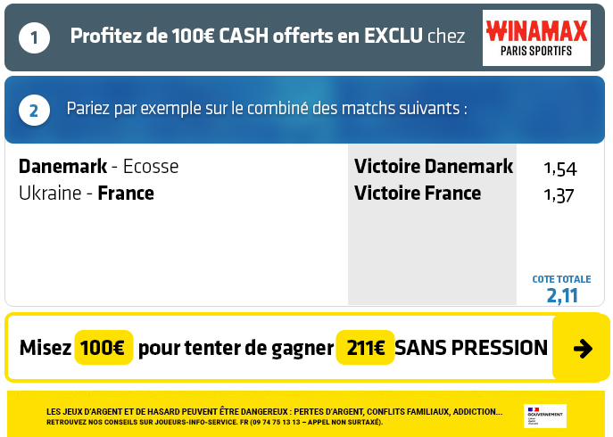 ► Misez par exemple sur le pari "Victoire France + Victoire Danemark" (cote à 2,11) chez Winamax :