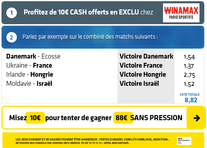 ► Misez par exemple sur le pari "Victoires France + Danemark + Hongrie + Israël" (cote à 8,82) chez Winamax :