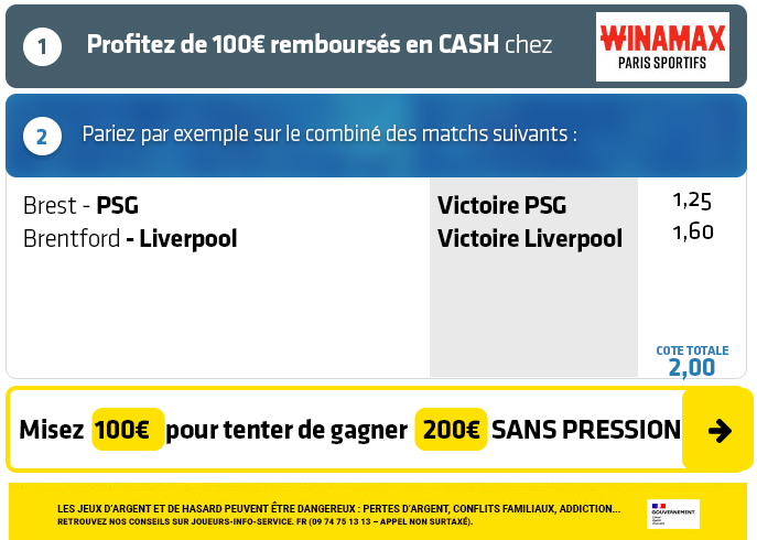 ► 1- Misez par exemple sur le pari "Victoire PSG + victoire Liverpool" (cote à 2,00) chez Winamax :
